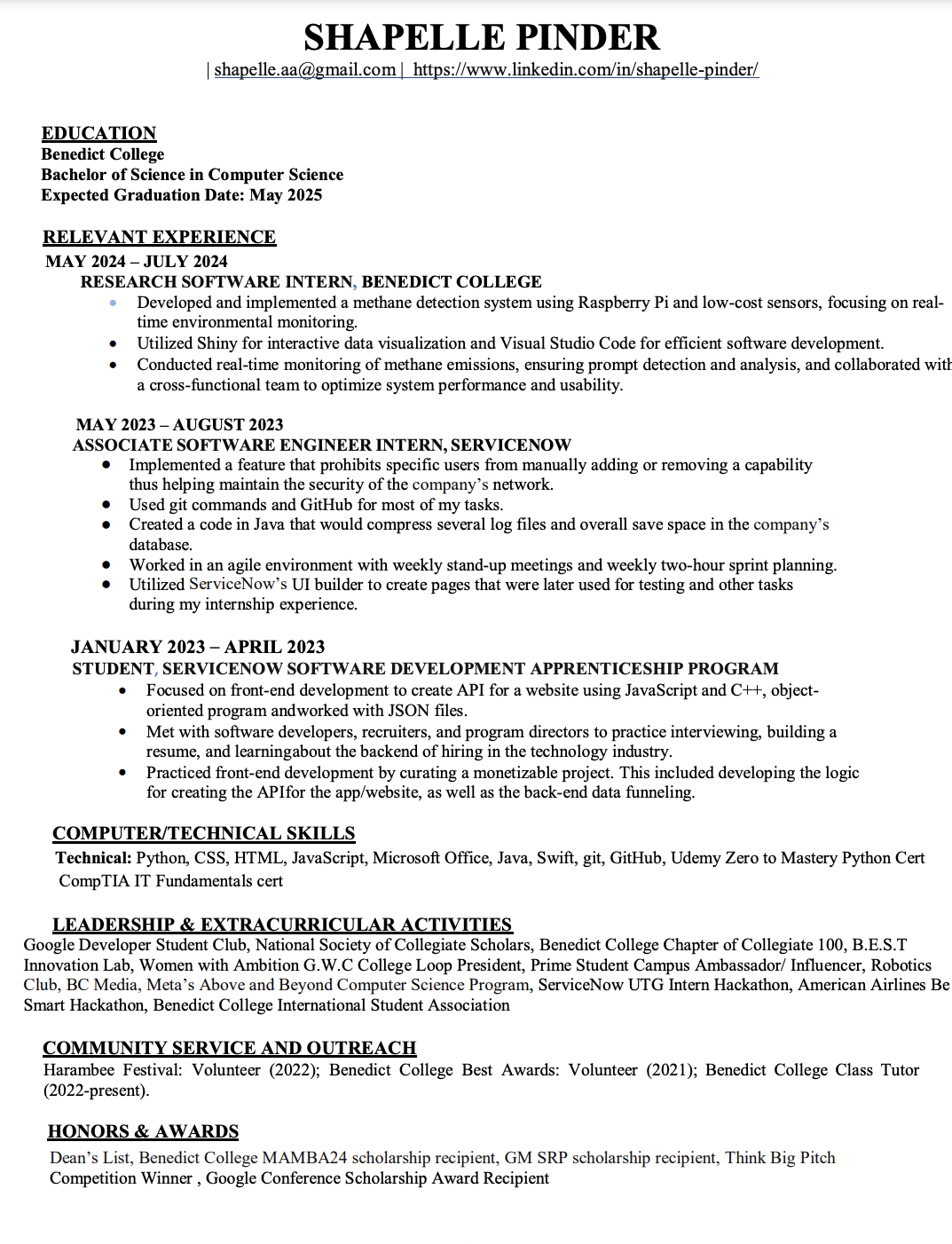 Driven by curiosity and ambition, I am Shapelle Pinder, a dedicated and collaborative team player at the heart of innovation. As a proud first-generation college student majoring in Computer Science at Benedict College, I thrive on the challenges and opportunities that technology presents. My academic journey has been a deep dive into the dynamic realms of both frontend and backend development, where I've sharpened my expertise in essential programming languages such as Python, HTML, and CSS.